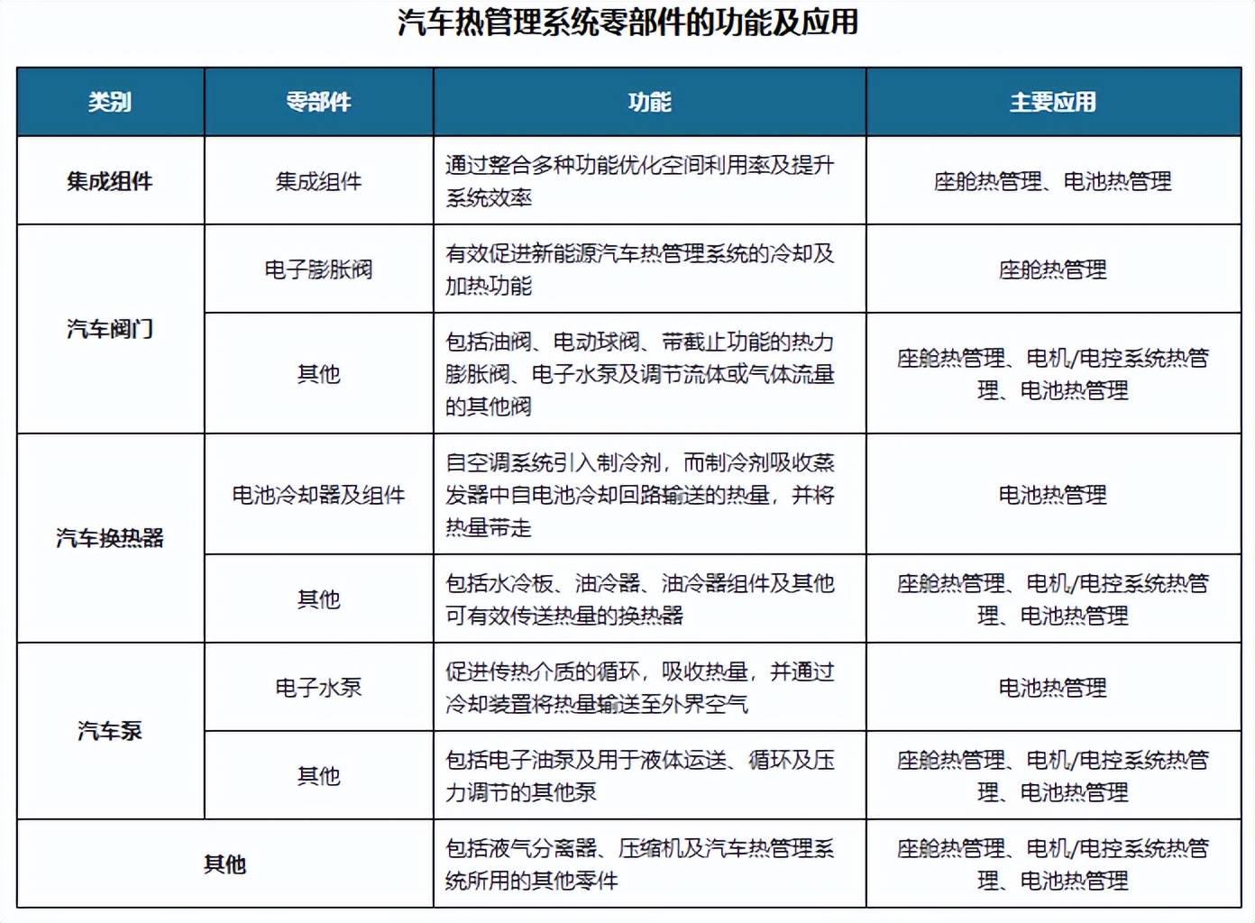 汽车热管理系统主要零部件包括各类阀(热力膨胀阀、电子膨胀阀、电磁阀、多通水阀等)、泵(机械水泵、电子油/水泵等)、热交换器(前端模块、空调箱、电池冷却器、电池水冷板)、压缩机以及管路系统等,并按需应用于发动机、变速箱、电池、电机电控和空调系统等部位。
